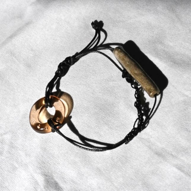 Materials: Polyester cord (black), plastic cord, vintage acrylic, clay