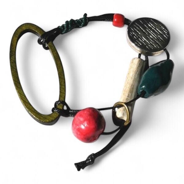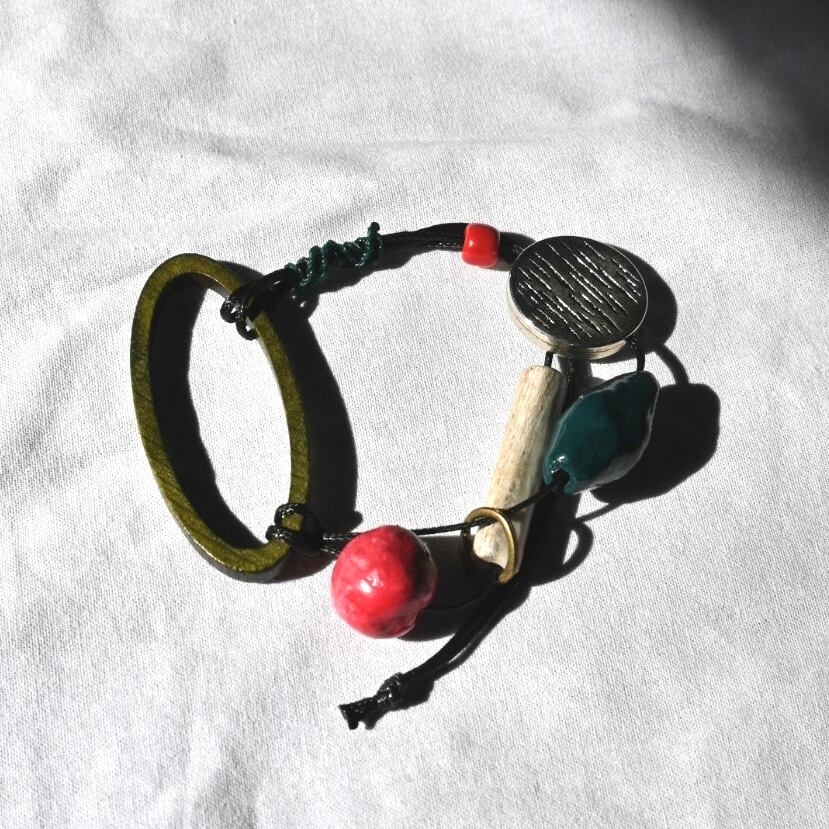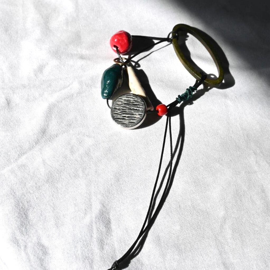 Materials: Polyester cord (black), plastic cord, deer horn, wood, brass, vintage metal, acrylic, clay