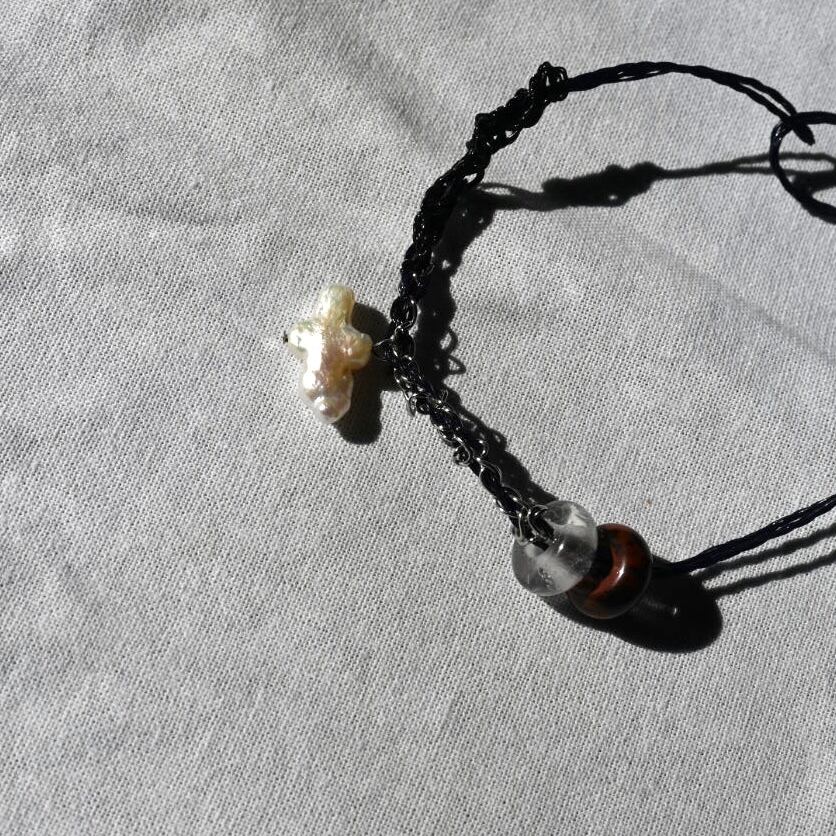 A handcrafted bracelet featuring black plastic cord, natural stone, freshwater pearl, and stainless steel chain.
