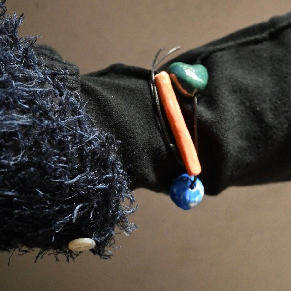 Crafted with black polyester cord and acrylic and clay-like resin parts in coral red, deep green, and blue.