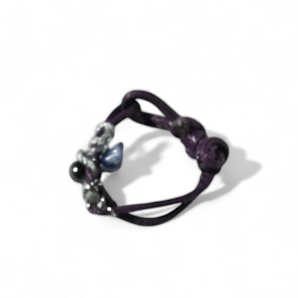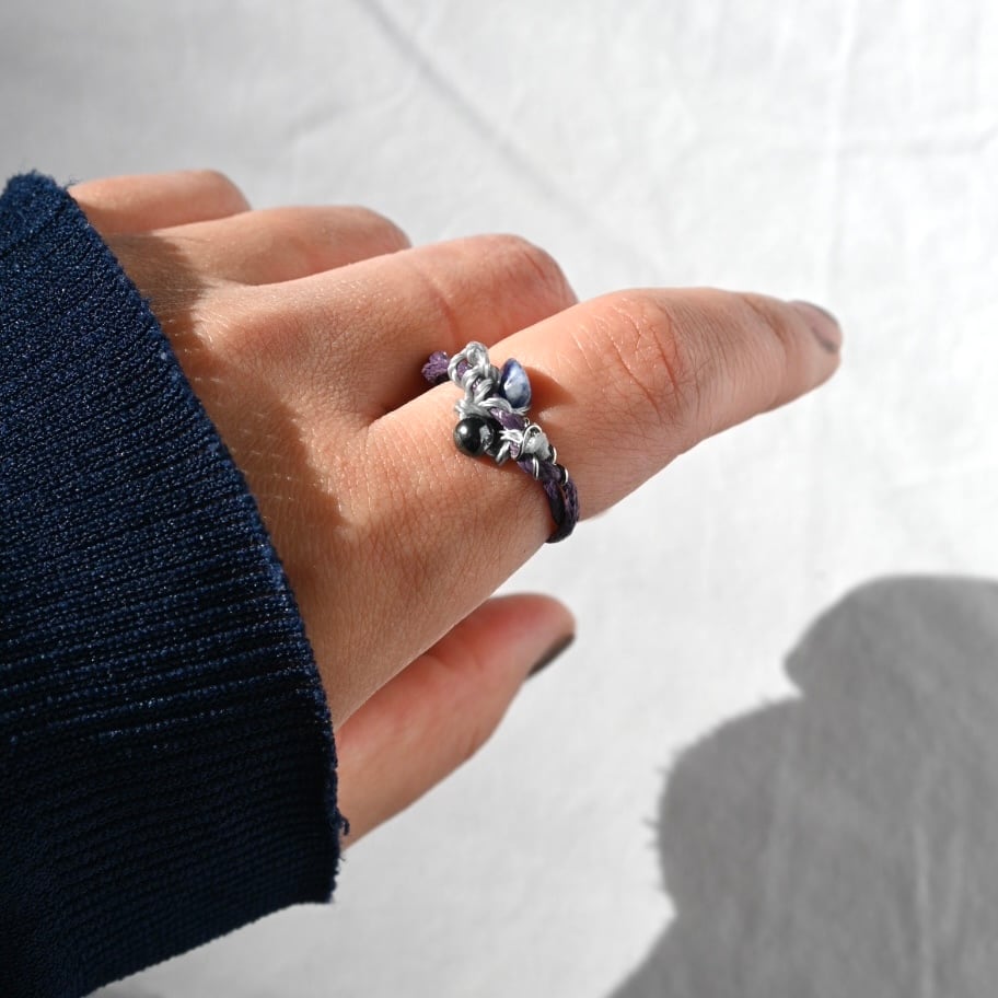A hand-tied adjustable cord ring featuring navy polyester cord, natural stones, and coated glass beads, accented with a stainless steel chain.