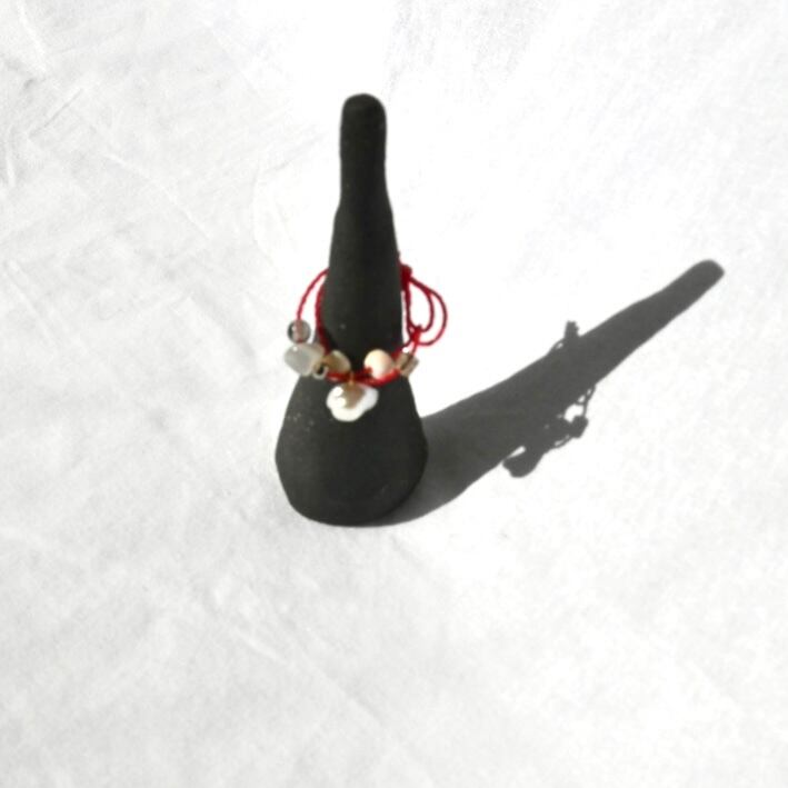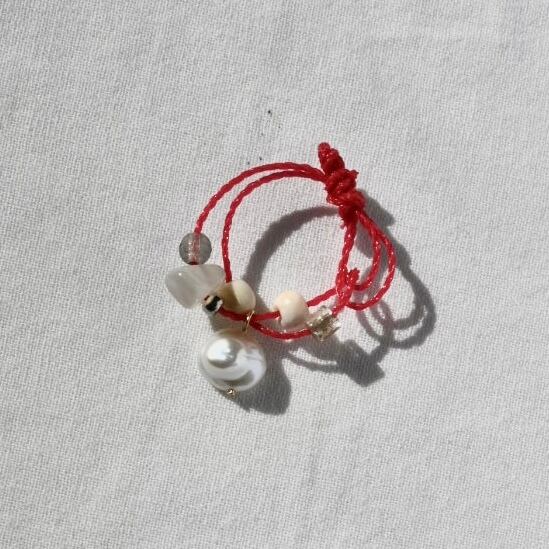 An adjustable handmade ring featuring a vivid red plastic cord combined with freshwater pearls, natural stones, and bone beads.