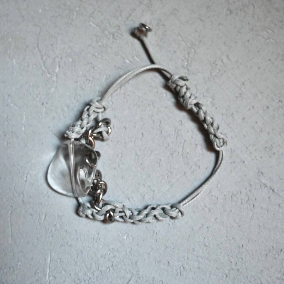 透明感のあるアクリルパーツを主役に、ライトグレーのコードで編み込んだブレスレット。