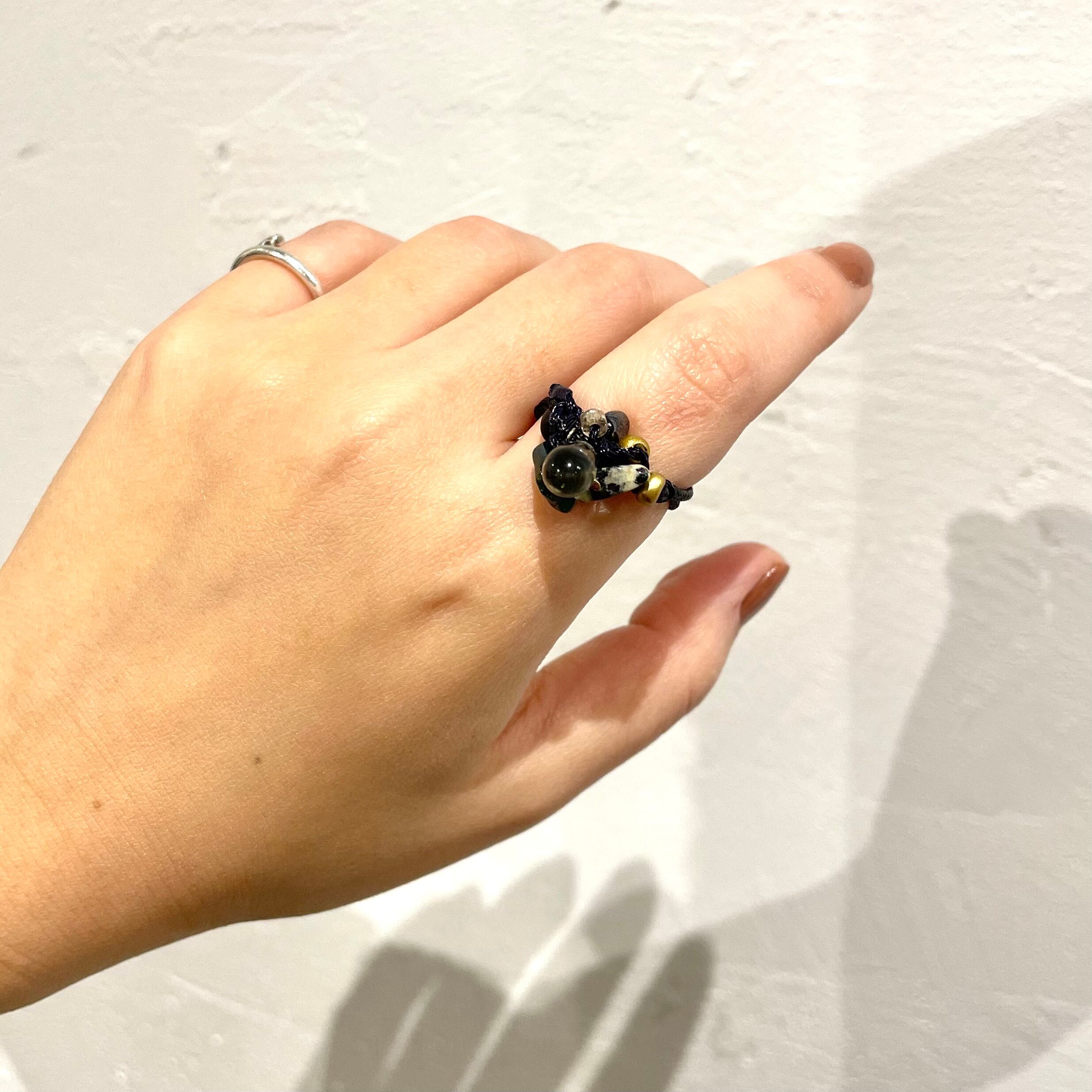This adjustable code ring features a black polyester cord combined with natural stone and mixed material parts.