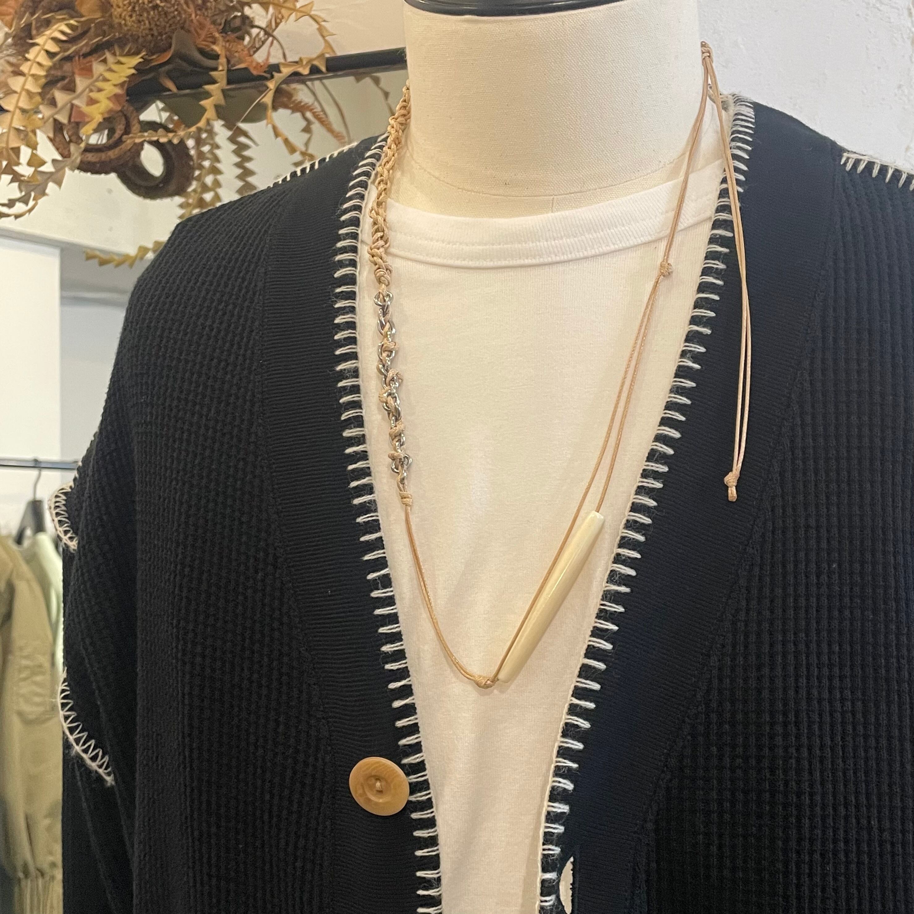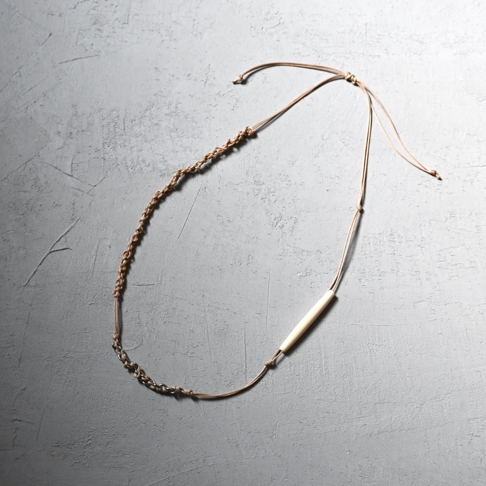 自然素材の温もりと、ポリエステルコード・ステンレスチェーンの無機質さ。