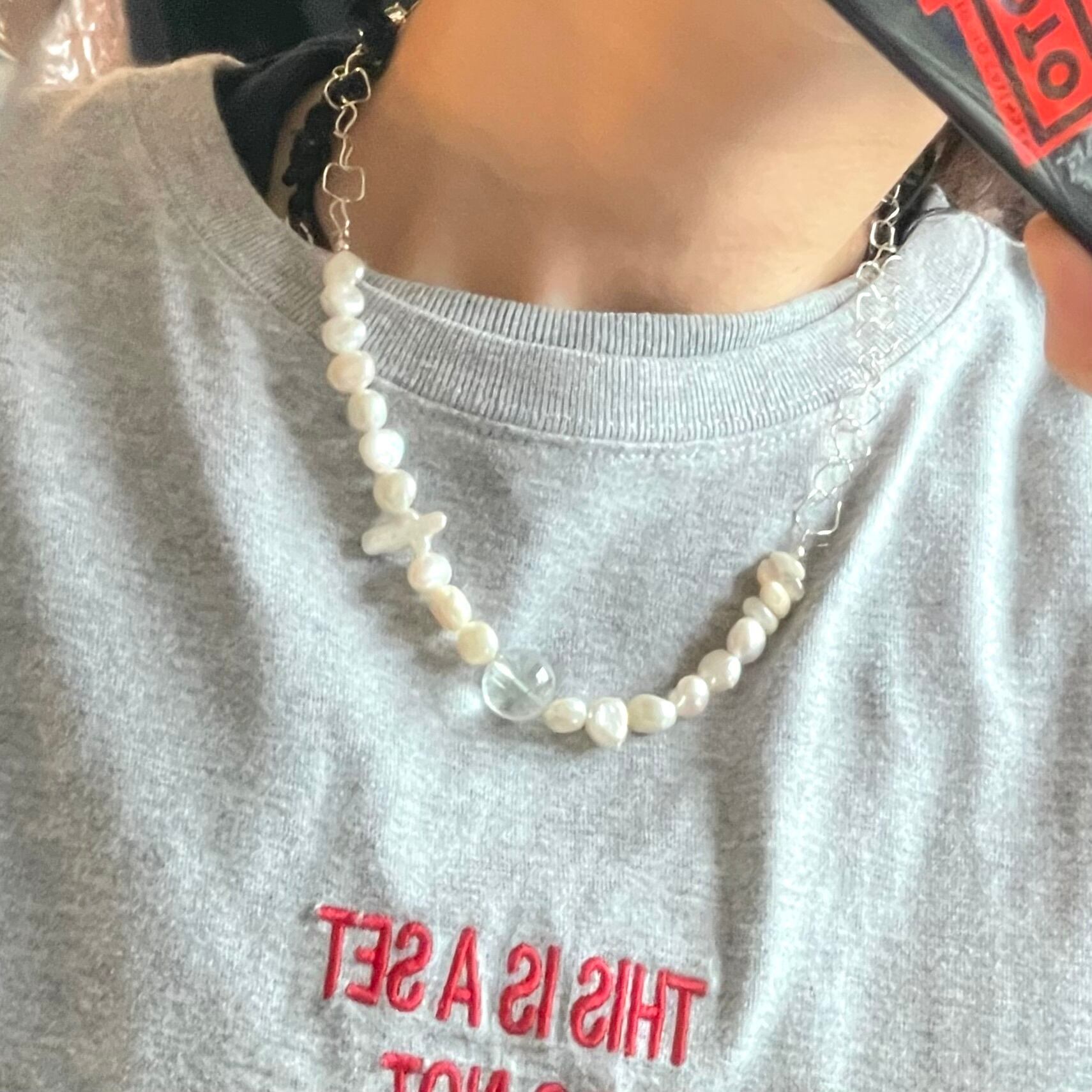 ニュアンスのあるシルバーチェーンを合わせたネックレス。
