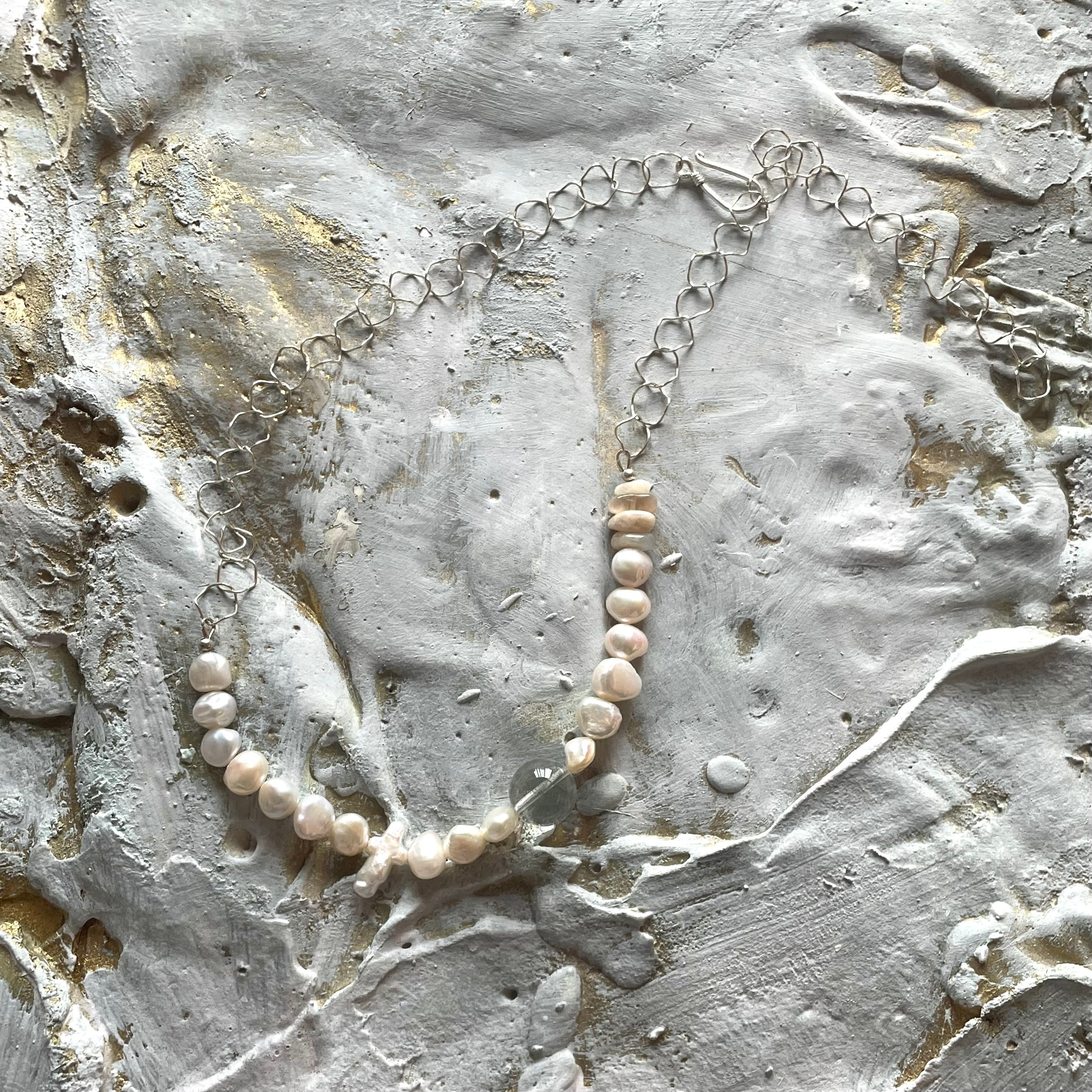 A necklace combining the soft luster of freshwater pearls with a nuanced silver chain.