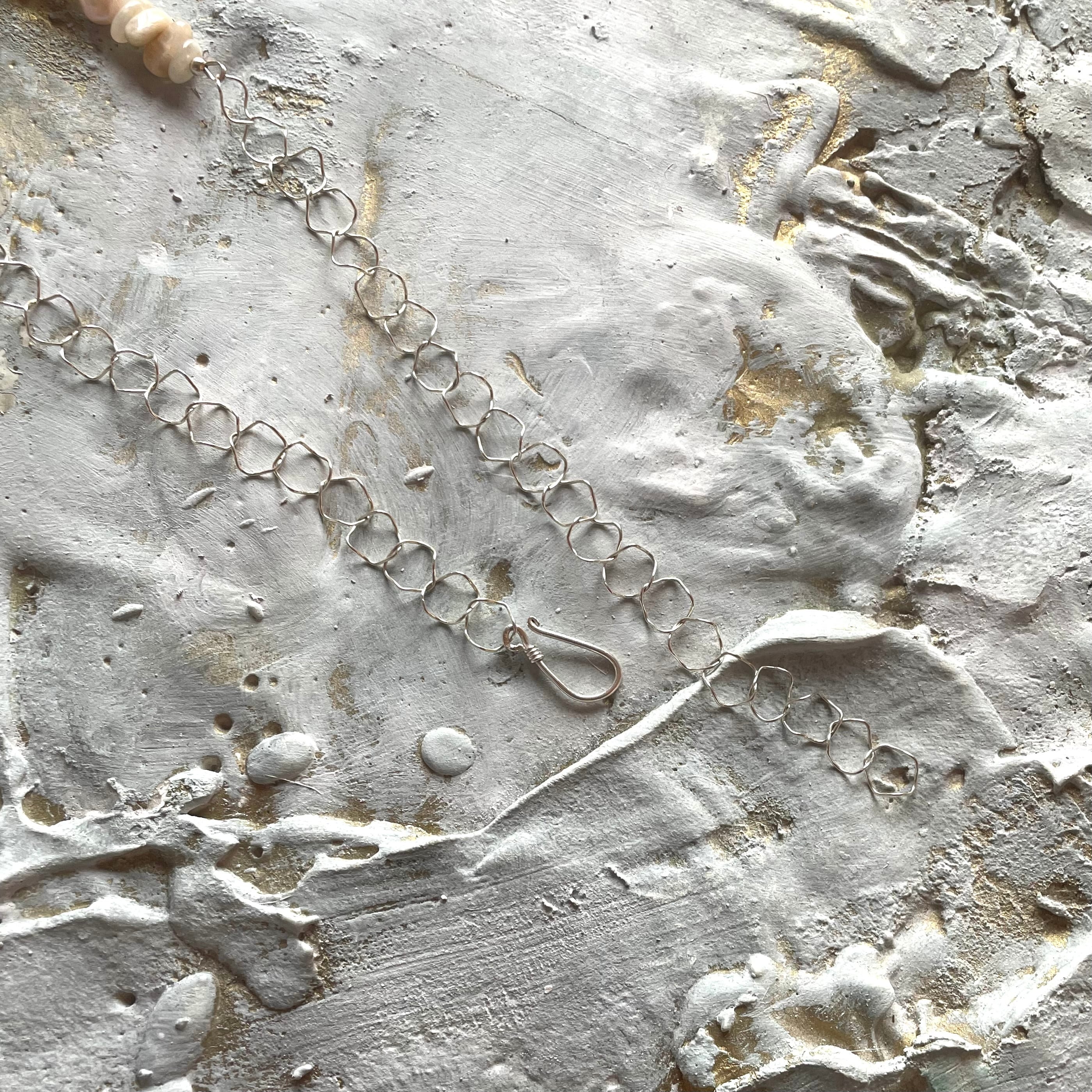 The natural shape of the pearls is complemented by accents of Karen silver and natural stones, creating a design that is simple yet full of character.
