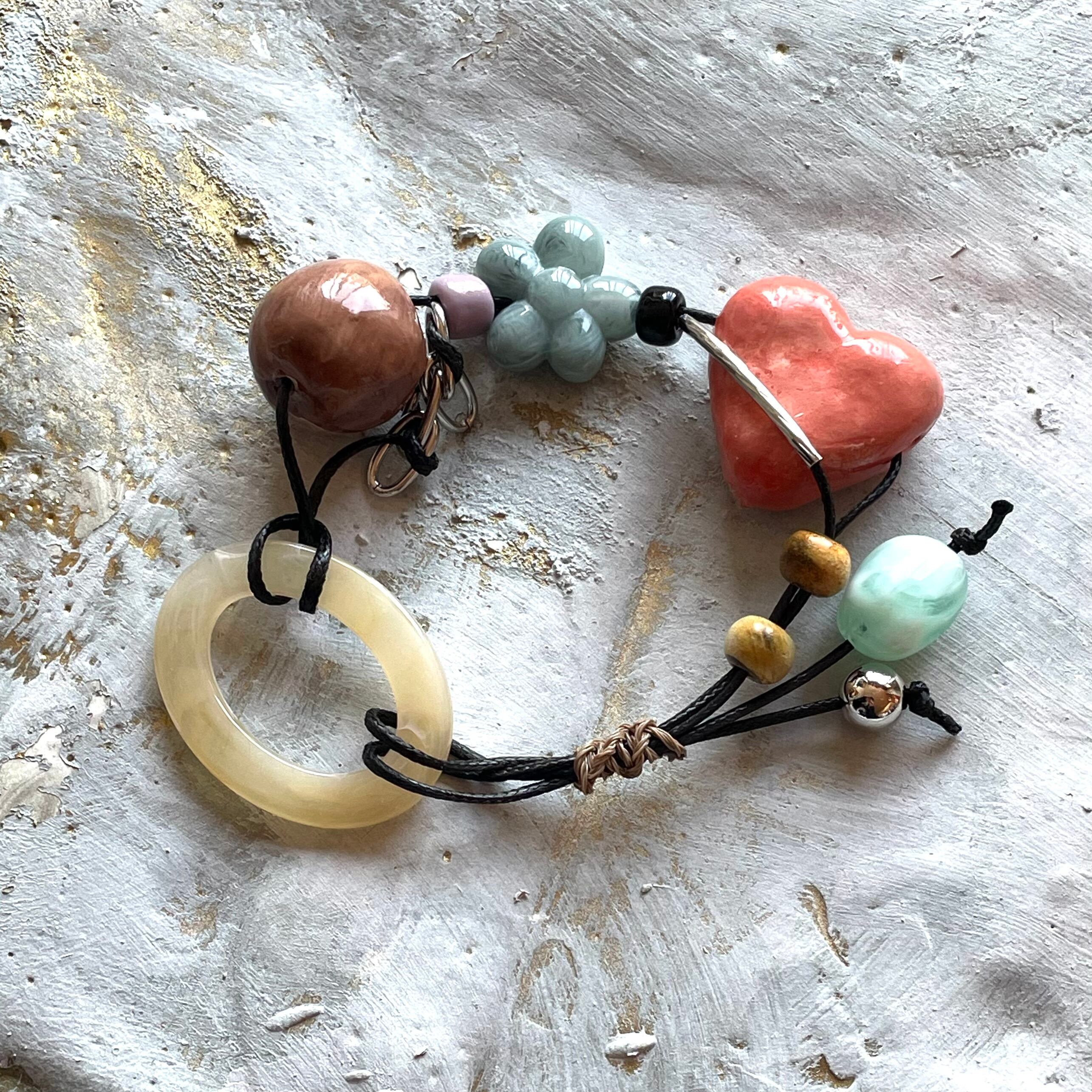 Crafted from black polyester cord, stainless steel, brass, acrylic, and clay,